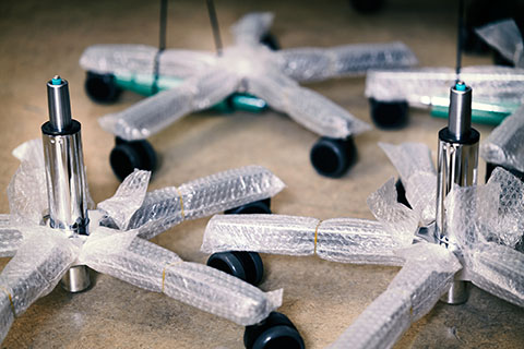 Bereit zum Einpacken! Sobald die ergonomischen Bürosessel fertig zusammengebaut und getestet sind, werden sie sorgfältig verpackt.